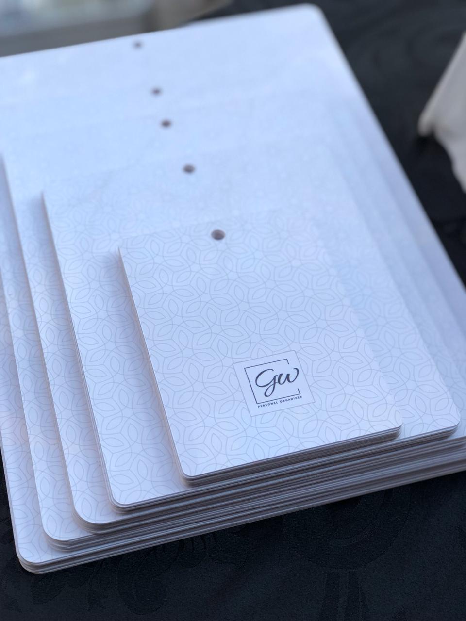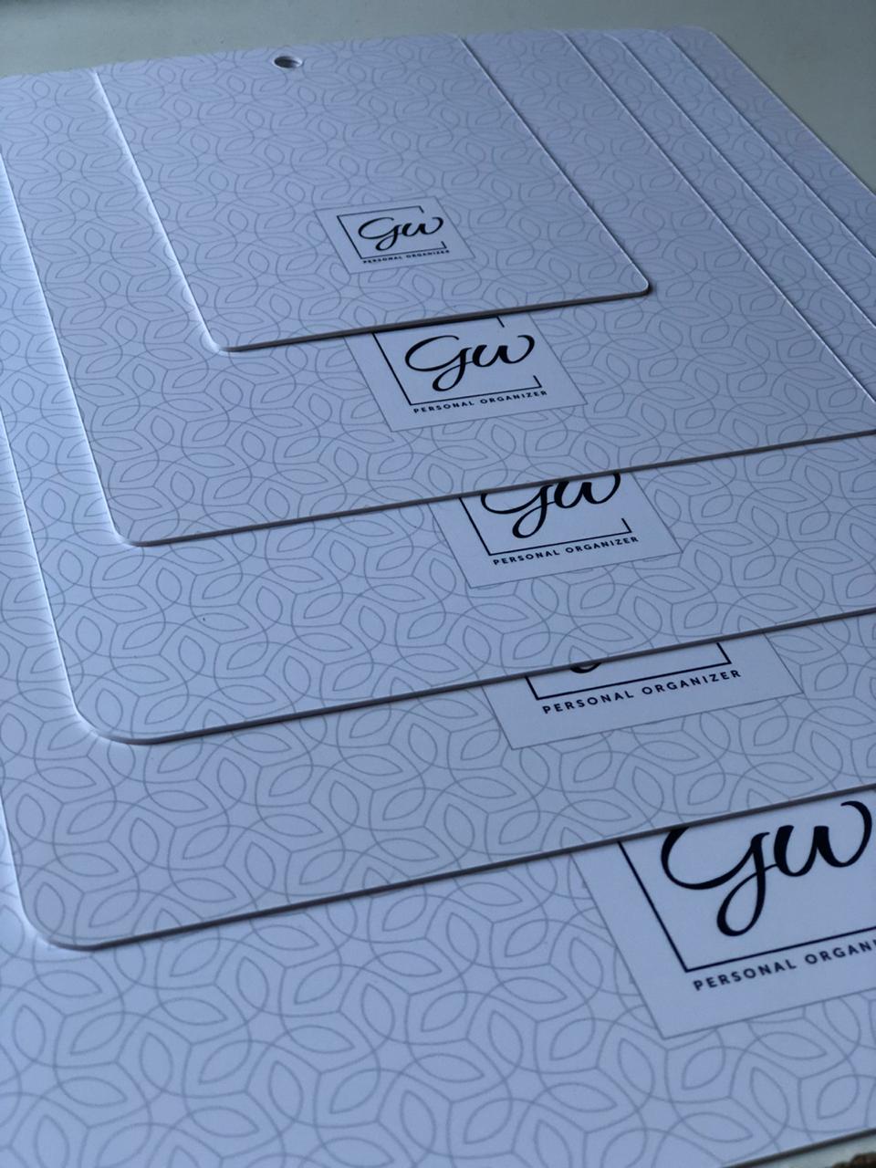 Kit gabaritos, material PS branco, 1mm, com 5 tamanhos que se transformam em 10 utilizando-se também sua lateral. A possibilidade da variação de tamanhos foi pensada para propiciar a melhor adequação à diversidade de dimensões de gaveta.